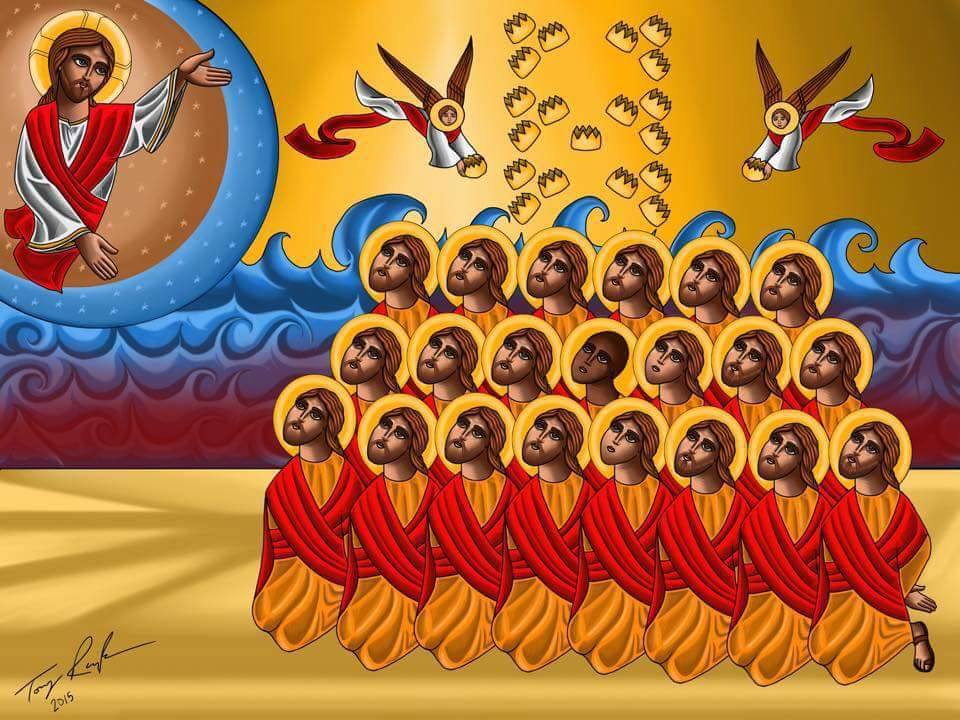 Martyrs are important in the history of the Church. And in the wake of these new martyrs, it is important to point out that the Church sees the meaning of their death not in political or worldly terms at all, but in spiritual, eternal terms. Yes, these 21 men were political prisoners, but this is not why they are martyrs. Yes, these men were killed brutally and publicly, but this is not why they are martyrs. Yes, these men were unjustly executed, but this is not why they are martyrs. Yes, these men were killed on a “battlefield”, but this is not why they are martyrs. They are martyrs because they imitated Christ, who faced His own unjust, political, brutal, public execution freely, knowing that the real, eternal battle was about to be fought and won in His death and resurrection. The Romans, The Judean authorities, the factions of insurgents, those who wished to either cause or co-opt His death for their own worldly purposes, none of them had any power over Him. Jesus said, “No one takes it from me, but I lay it down of my own accord. I have authority to lay it down and authority to take it up again. This command I received from my Father” (John 10:18). This is at the heart of martyrdom. It is not at all about a “holy” war against flesh and blood, of ‘us vs. them’. It’s not about an earthly power struggle. It is a bold proclamation of the real battle we all must face each day in our own hearts even as there are those who face this battle in a visible way, as we see in the new martyrs. It is also a proclamation of the real victory which has already been won by the One whom lays His life down freely for the salvation of all mankind.